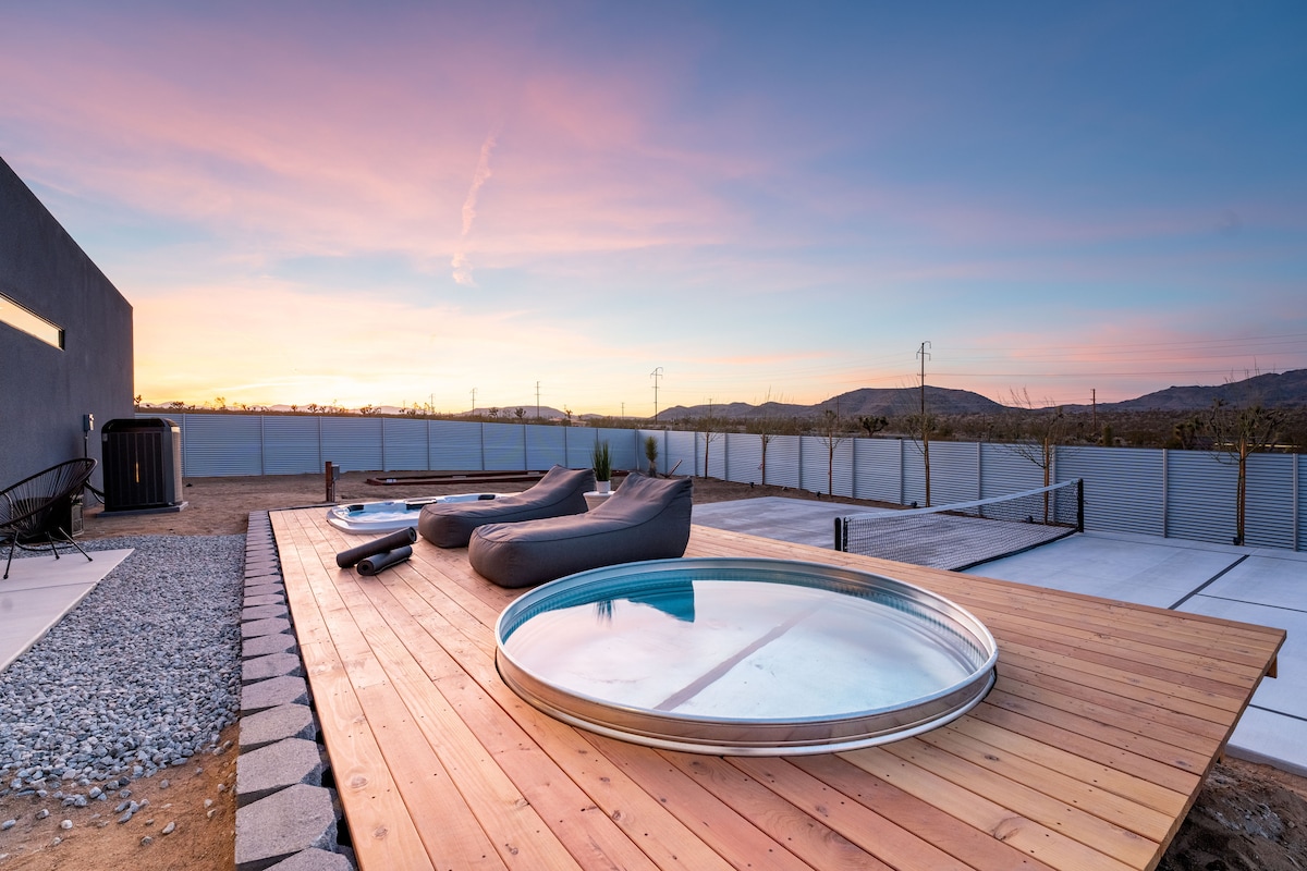 The Joshua Tree Wabi Sabi House embraces this Japanese zen philosophy with a twist on mid-century modern. This tranquil fully-fenced 2.5 acre desert retreat has an unobstructed views of the valley, mountains, and sky. Enjoy a truly curated outdoor space featuring a rock tub, outdoor shower, jacuzzi, hammocks, BBQ, patio dining area, cactus garden and fire pit. Embrace the natural beauty of the high desert to relax, reset, and reinvigorate. Only a 15 minute drive to Joshua Tree National Park.