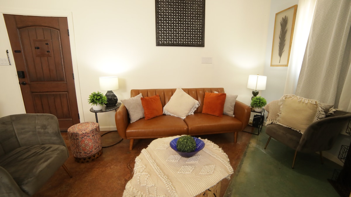 Ideali centrinė vieta, kurioje svarbus privatumas! Jis prasideda nuo stovėjimo vietos netoli įėjimo vartų. Įeikite į aptvertą teritoriją ir mėgaukitės visa gražiai dekoruota lauko poilsio zona su kepsnine ir valgomuoju. Mėgaukitės svečių namais su geriausiais į detales orientuotais baldais ir patogumais, kuriuose yra 2 miegamieji, 1 vonios kambarys, pilnai įrengta virtuvė, svetainė su namų biuro darbo vieta ir sofa-lova. Skalbyklė/džiovyklė ir kitos gražiai įrengtos erdvės, kad patenkintų visus asmeninius poreikius.