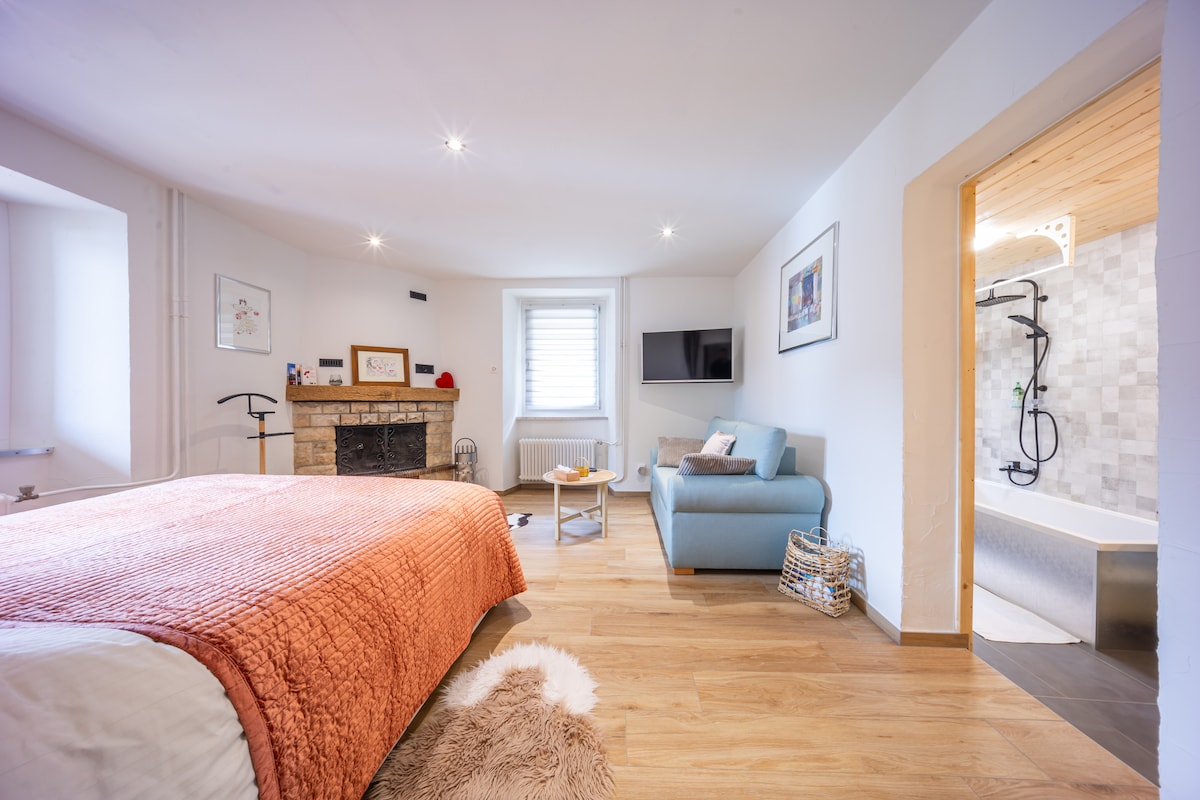 Pridėkite rąstus prie židinio su didžiule akmenine širdele ir atsipalaiduokite ant kaimiškos medinės sofos. Žvilgsnis pro langus Alpių miške, supančiame autentišką poilsio namelį. Grįžkite iš šlaitų ir atsipalaiduokite prabangioje pirtyje trobelėje. 25 m2 miegamasis su dvigule lova, saugykla, autentiška spinta. Šilta ir erdvi svetainė su dviviečiais langais, iš kurių atsiveria vaizdas į Mt Blanc ir židinį. Ir sofa-lova, paverčiama 2 viengulės lovos. Patogi ir pilnai įrengta virtuvė. Granito vonios kambaryje yra dušas ir pirtis 3 žmonėms. Terasa priešais mišką ir upelį (dažnai lankoma elnių - žr. nuotraukas ) su fontanu ir kvapą gniaužiančiais vaizdais į Mt Blanc masyvą. Poilsio namelis yra individualus, visiškai prieinamas ir skirtas svečiams. Taip pat terasa ir aplinka ( maža upė, privatus tiltas ir priėjimas prie miško ). Pasiekiama, jei turite klausimų. Coupeau kaimelyje: autentiškas poilsio namelis miške virš Houches, iš kurio atsiveria išskirtiniai Monblano masyvo vaizdai. Mažo torrento su elniais pakraštyje yra elnių 5 minutės automobiliu iki Les Houches, 10 minučių iki Chamonix, 1 val. iki Ženevos. Lengvas susisiekimas keliu iki poilsio namelio. 2 km nuo Les Houches ir 10 km nuo Chamonix. Automobilių stovėjimo aikštelė už poilsio namelio Visiškai renovuotas senas poilsio namelis. Su visais šiuolaikiniais patogumais ( įskaitant pirtį 3 asmenims) ir viršutine apdaila. Unikaliu vaizdu į Monblano grandinę. Vasarnamis yra Coupeau kaimelyje, miške virš Les Houches, su išskirtiniais Mont Blanc vaizdais. Iki Les Houches galima nuvykti per 5 minutes, iki Chamonix - per 10 minučių, o iki Ženevos - per valandą.