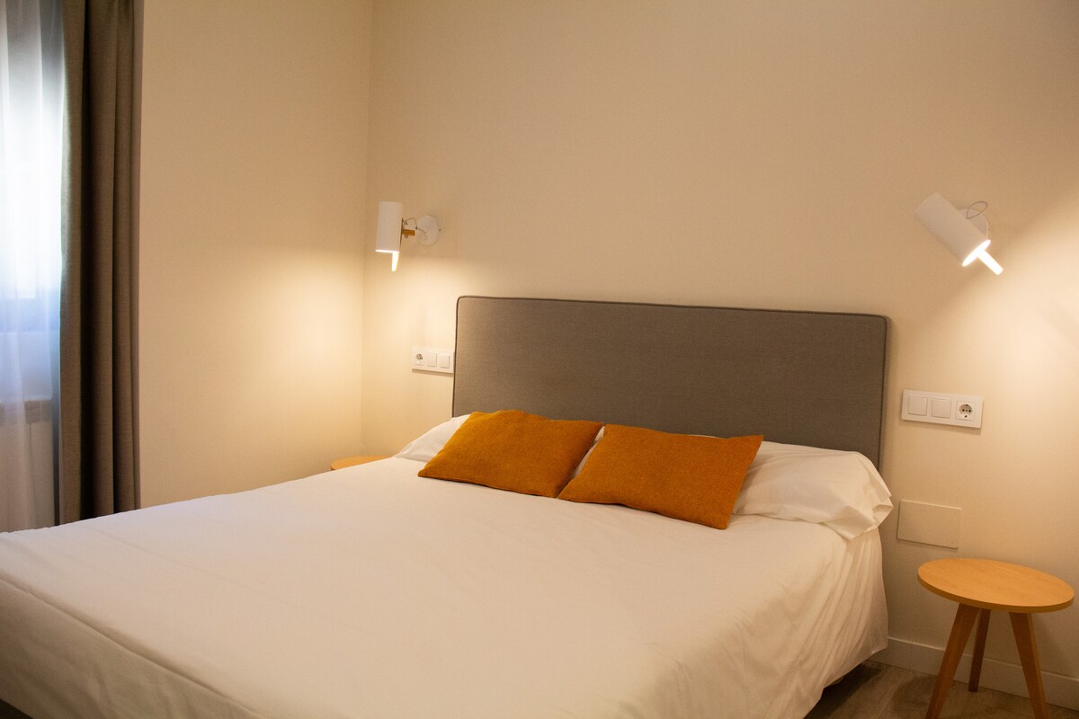 Relájate en esta habitación amplia y moderna con baño privado, pensada para que desconectes sin prisas. La cama doble de 2 metros te envuelve en comodidad. La televisión está ahí para tus momentos de ocio, el escritorio para cuando necesites concentrarte. Con luz suave, líneas limpias y un ambiente tranquilo, es el rincón perfecto para dejar que el tiempo fluya a tu ritmo.