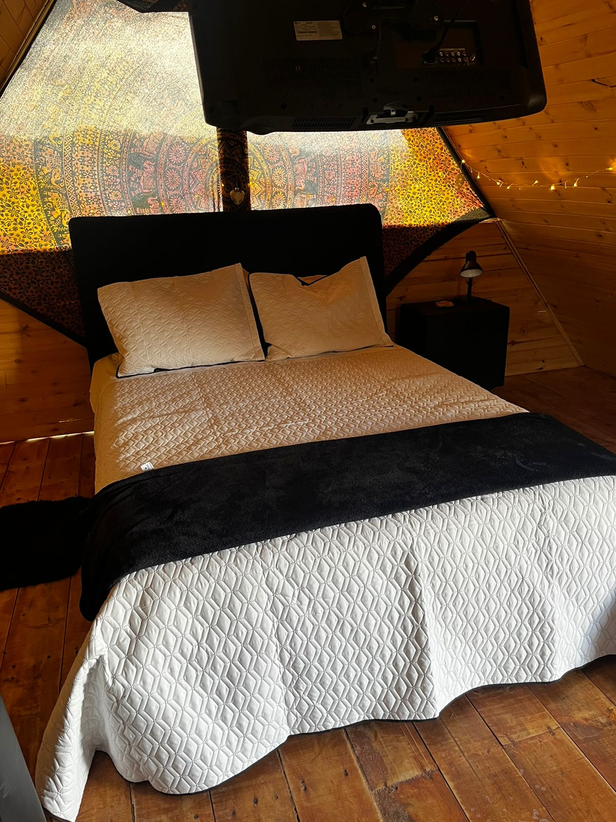 Ši trobelė yra pagaminta tik iš medžio ir suteikia jai ypatingą ir romantišką įspūdį. Jo dizainas kviečia svečius mėgautis kiekviena erdve ramioje vietoje, atokiau nuo praminto tako ir gamtos teikiamais potyriais. Pirmame lygyje rasite tris modulius: virtuvėlę, staliuką, kuriame galėsite mėgautis maistu ar darbu, ir patogią sofą. Vonios kambarys su, taip, karštu vandeniu. Miegamasis su nuostabiu vaizdu į sodą, kalnus ir keletą gražių medžių. Antrasis lygis yra 323 pėdų2 stogas su 360 laipsnių vaizdu.