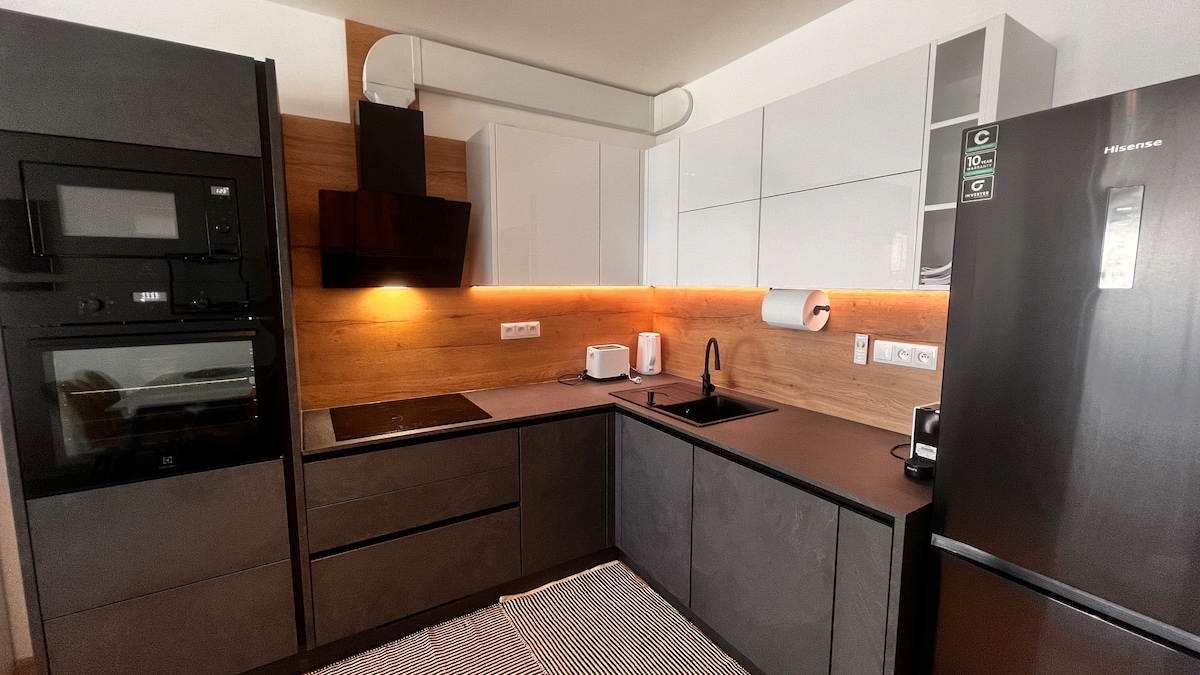 Šis vieno miegamojo butas yra ramioje Česke Budejovicės gyvenamojoje zonoje (už 150 km nuo Prahos) ir turi fantastišką bei erdvią į vidų atsiveriančią terasą. Bute yra erdvi atviro plano virtuvė-svetainė ir pilnai įrengta virtuvė (mikrobangų krosnelė, kaitlentė, orkaitė, indaplovė ir šaldytuvas). Poilsio kambaryje yra LED televizorius. Yra belaidis internetas. Miegamajame yra oro kondicionierius. Miegamajame įrengti „Velux“ langai, pro kuriuos atsiveria vaizdas į švarų parką, maždaug 50 metrų atstumu nuo geležinkelio. Automobilį galima pastatyti gatvėje.